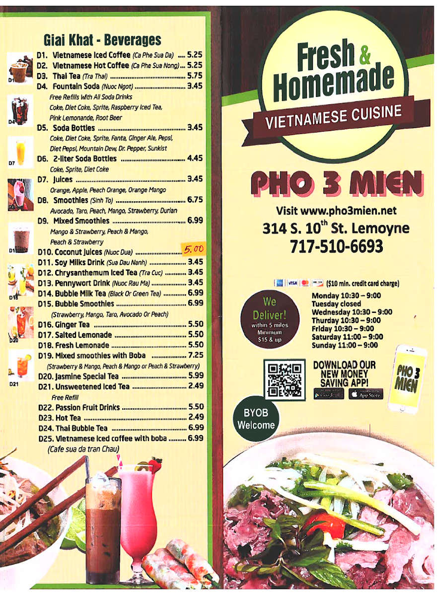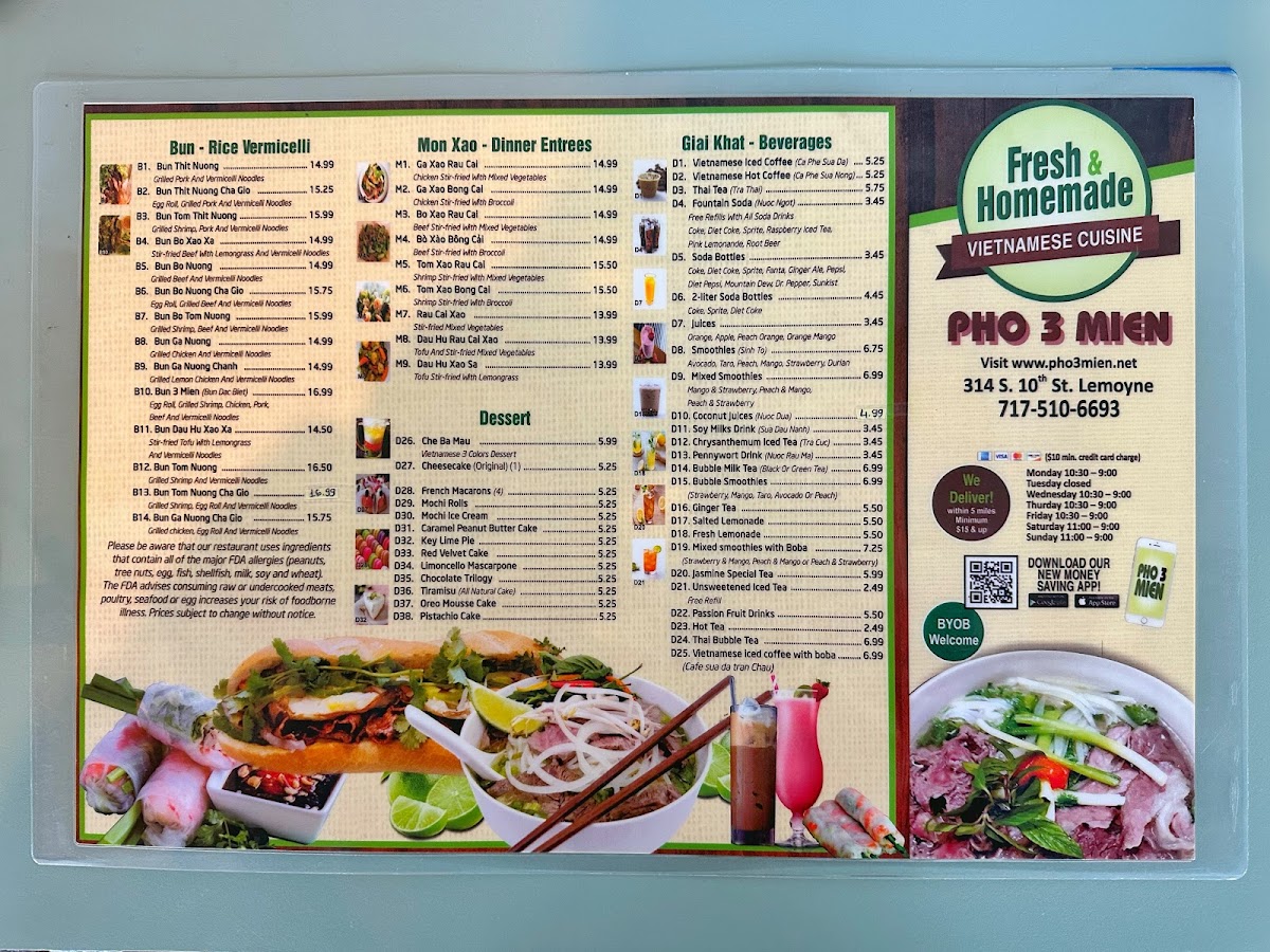 Welcome to Pho 3 Mien, where the vibrant flavors of Vietnam come to life in a cozy setting located at 314 S 10th St, Lemoyne, PA. Renowned for its extensive and authentic Vietnamese menu, this eatery stands out with its variety of noodle dishes, including the rich Seafood Udon and the hearty Beef Udon.